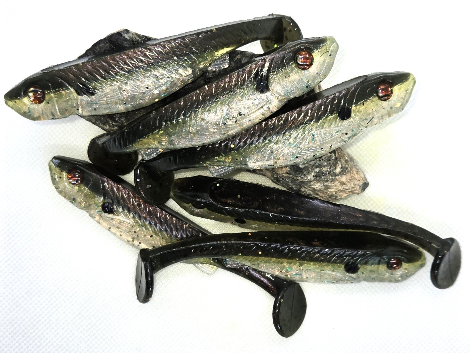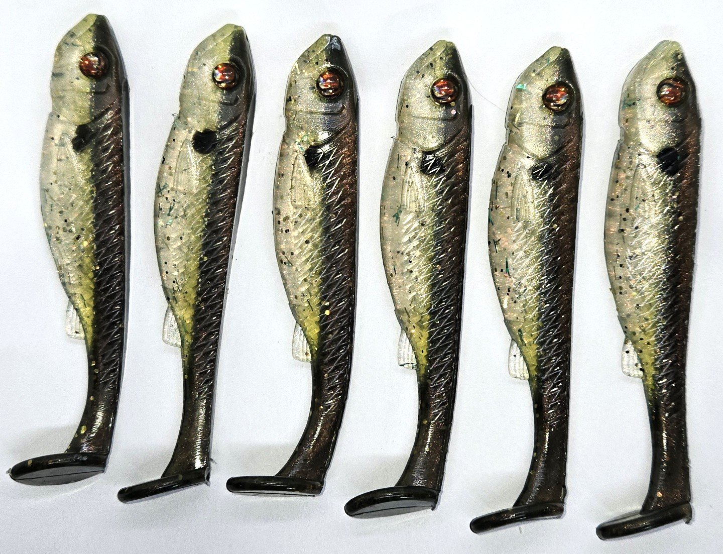 These 4" Swimbaits are all hand poured with only the finest materials available. They come 6 to a pack. They are best used on a #4 swimbait hook weighted, but can also be rigged weightless.
