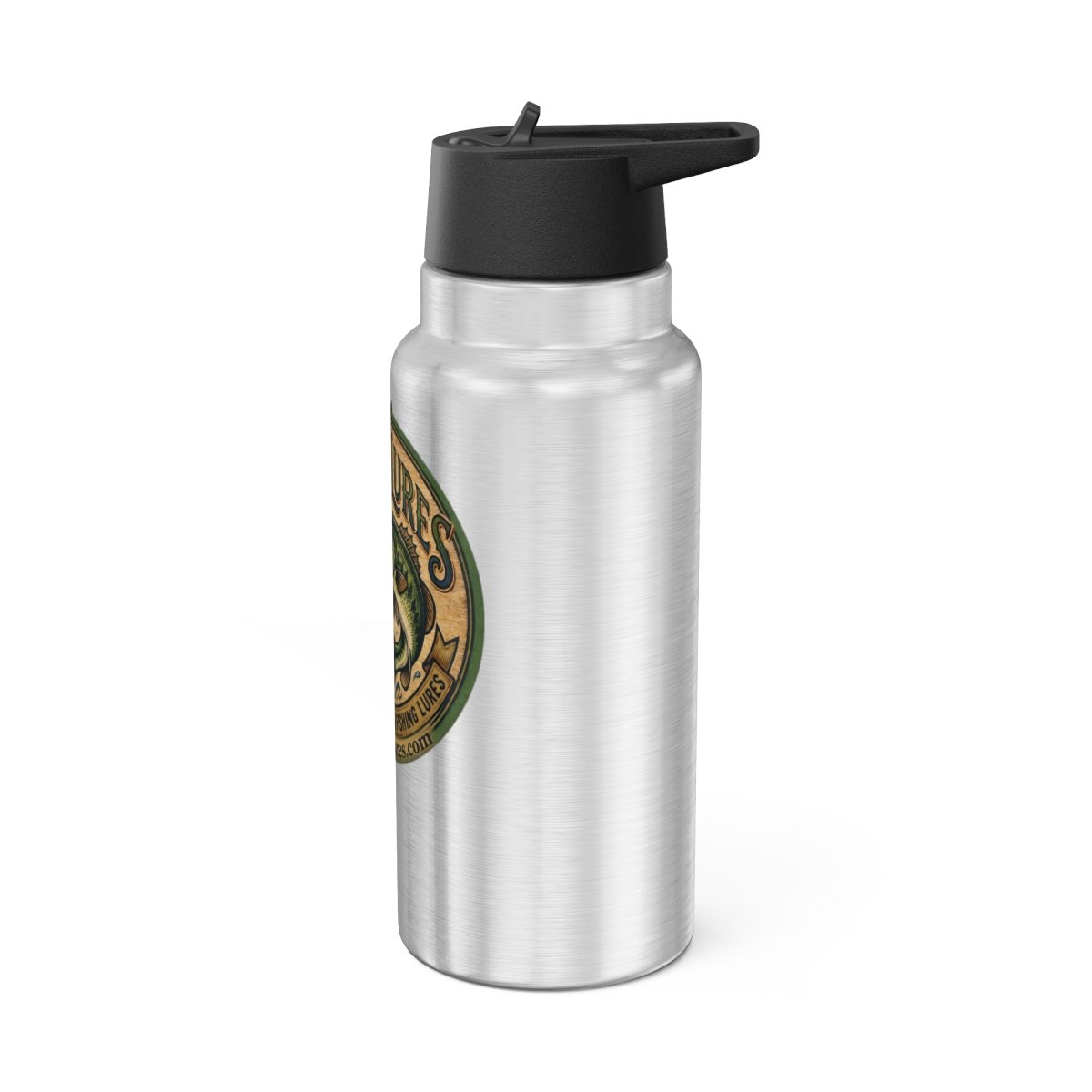 .: Materials: stainless steel bottle, black plastic screw-on cap