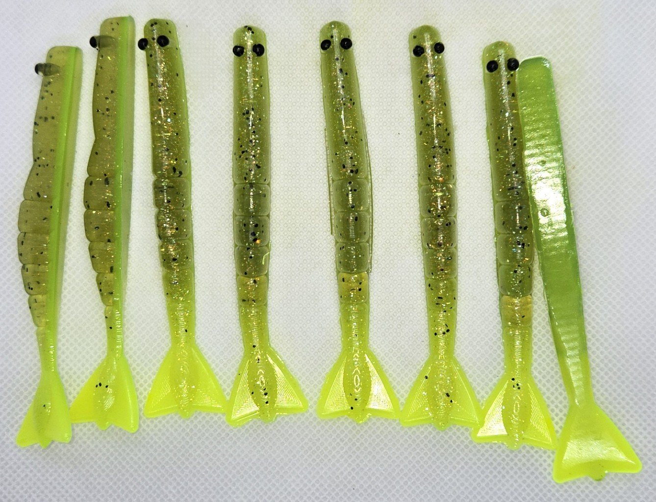 These are 4 inch custom hand poured shrimp. They come 12 to a pack. They can be rigged on a jig head or drop shot.